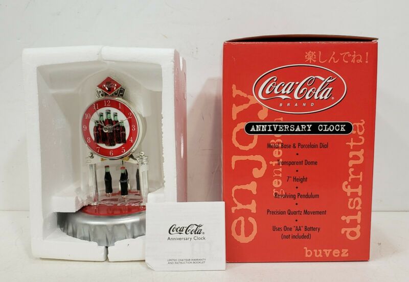 Title (ebay affiliate link): NOS COCA COLA ANNIVERSARY CLOCK W/ COKE BOTTLE REVOLVING PENDULUM DOME IN BOX