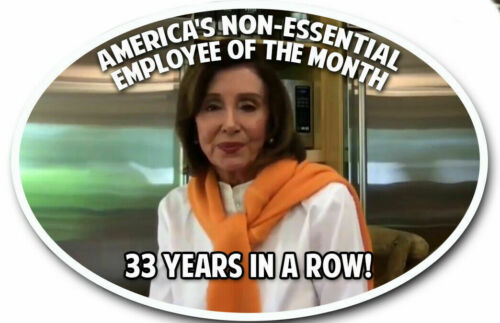 Title (ebay affiliate link): Pro Trump Anti Nancy Pelosi Non-Essential Employee of Month Political sticker