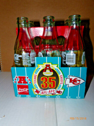 Collectable Coca Cola Texans/Chiefs AFL-AFC 35 years,six bottles,holder,football