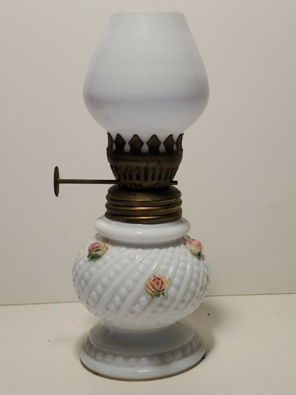 Title (ebay affiliate link): Vintage Miniature White Hobnail Milk Glass Oil Lamp Pink 3D Roses