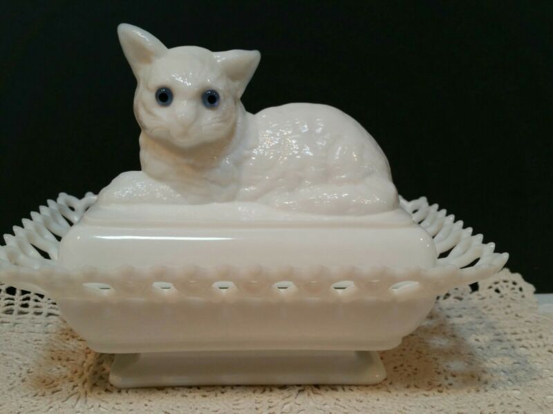 Title (ebay affiliate link): Vintage Westmoreland Wht Milk Glass CAT BUTTER DISH Blue Eyes Lace Edge 6.5"