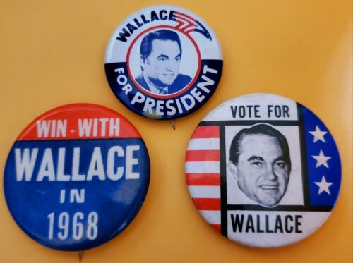 Title (ebay affiliate link): One 1 1/2" & Two 1 3/4" George Wallace Political Campaign Pinback Buttons