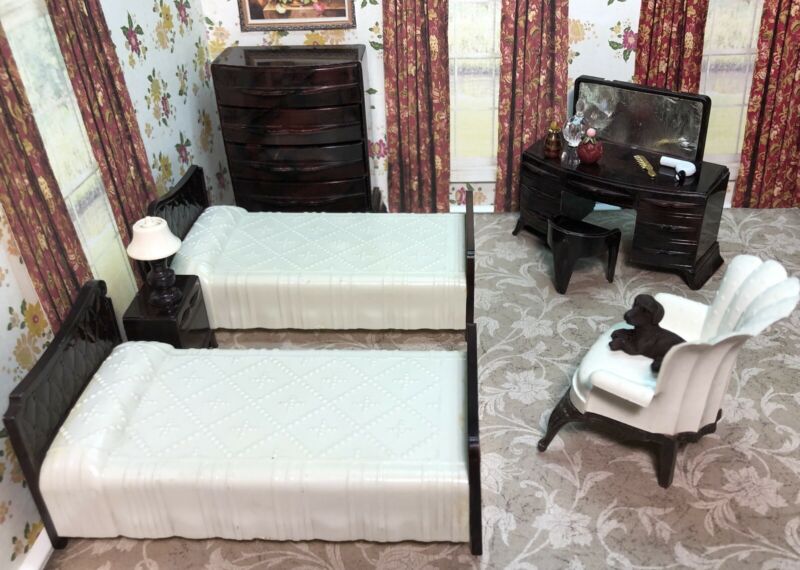 Title (ebay affiliate link): Plasco Renwal 8 PC BEDROOM SET Vintage Tin Dollhouse Furniture Ideal Plastic