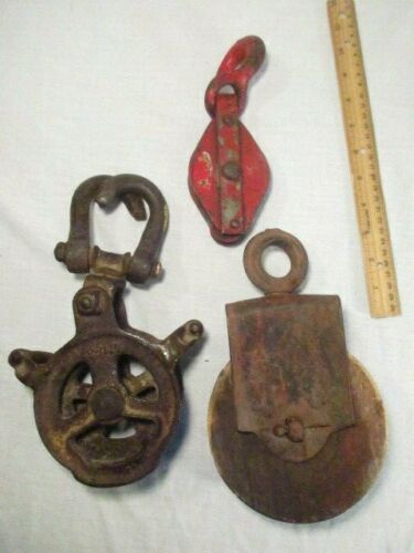Title (ebay affiliate link): 3 Vintage Pulleys Metal Wood Block And Tackle Parts Hay Hook Pulley System Pully
