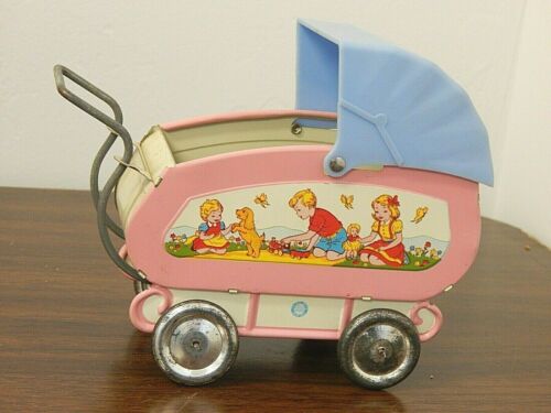 Title (ebay affiliate link): Vintage Ohio Art Pink Tin Illustrated Doll Baby Buggy/Carriage w/Plastic Hood
