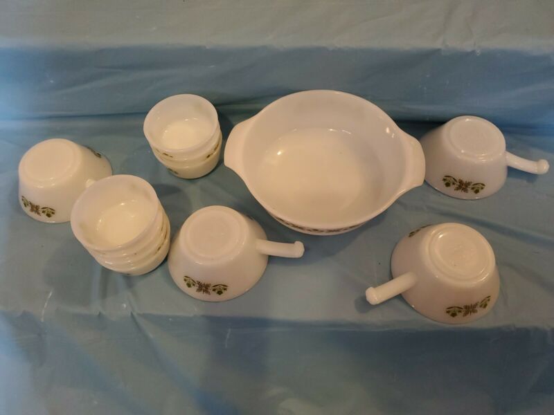 Anchor Hocking Fire King Meadow Green Lot:Handled Soup Tureen, Custard,Casserole
