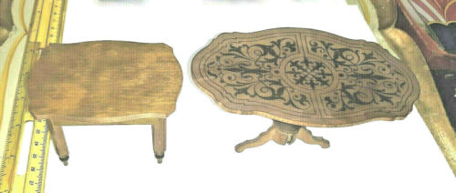 Title (ebay affiliate link): 2 VINTAGE VICTORIAN WOODEN FURNITURE TABLES FAUX GRAIN & PRINTED DESIGN LOT TLC