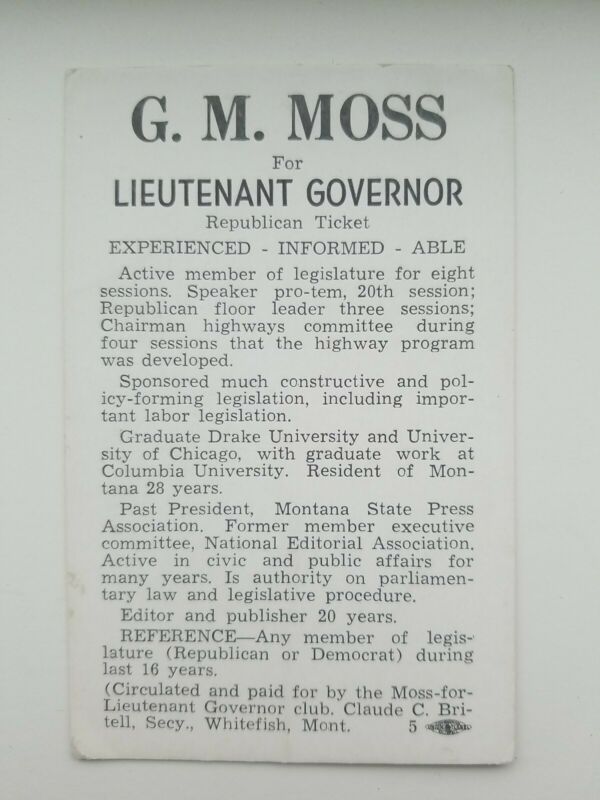 Title (ebay affiliate link): G.M. MOSS FOR LIEUTENANT GOVERNOR MONTANA. 1930''S -40''s ?