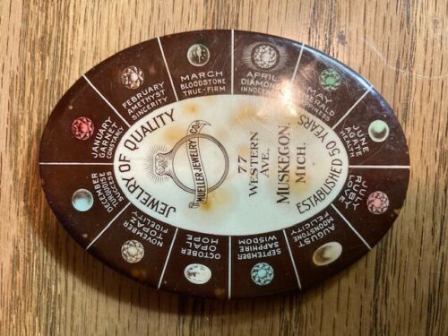 Title (ebay affiliate link): MUELLER JEWELRY CO MUSKEGON MI VINTAGE ADVERTISING CALENDAR POCKET MIRROR