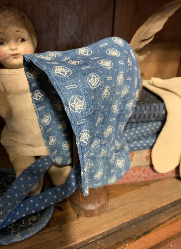 Title (ebay affiliate link): Old Spool & Sweet Primitive Doll Bonnet From Early Blue Calico Spool