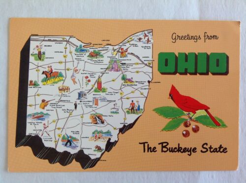 Title (ebay affiliate link): Greetings from Ohio~map~Buckeye State~bird cardinal~OH~Lucky Prints~chrome~4x6