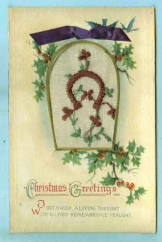 Title (ebay affiliate link): Embroidered, Embossed, "Christmas Greetings", a Horseshoe with Flowers, Holly...