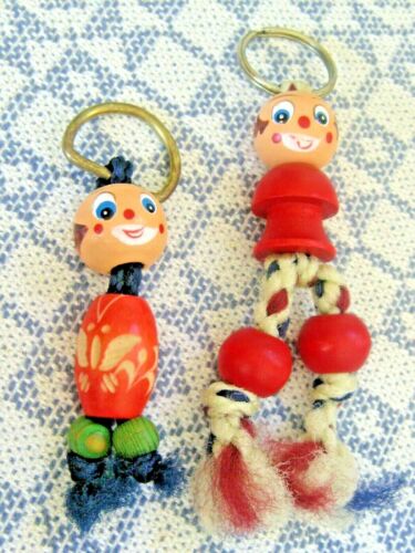 Vintage Kitsch Retro Handmade Macrame Painted Wooden Beads CLOWN Key Chains LOT