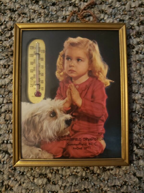 Title (ebay affiliate link): VINTAGE 1954 FRAMED GIRL PRAYING HANDS W/DOG FULL CALENDAR & THERMOMETER WORKS