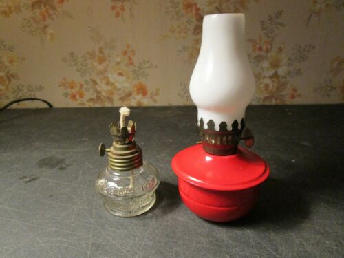 2 Vintage Mini Oil Lamps Red Metal Base Milk Glass, Vapo-Use Cresolene kerosene