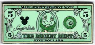 DISNEY PIN JIMINY CRICKET $5 DOLLAR BILL MICKEY MINT!!!