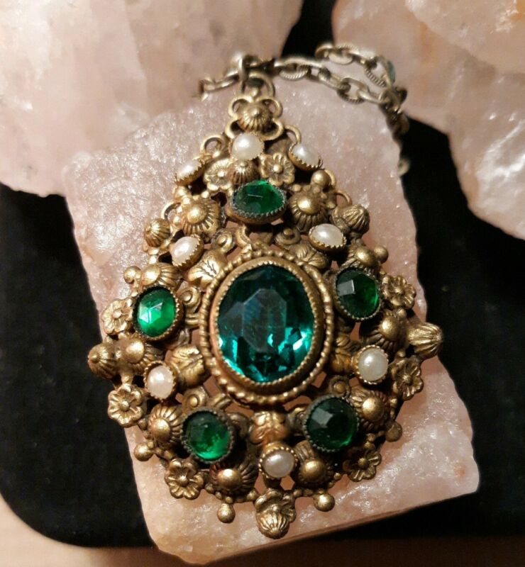 Title (ebay affiliate link): ANTIQUE ART DECO GREEN RHINESTONE FAUX PEARL VINTAGE BRASS NECKLACE