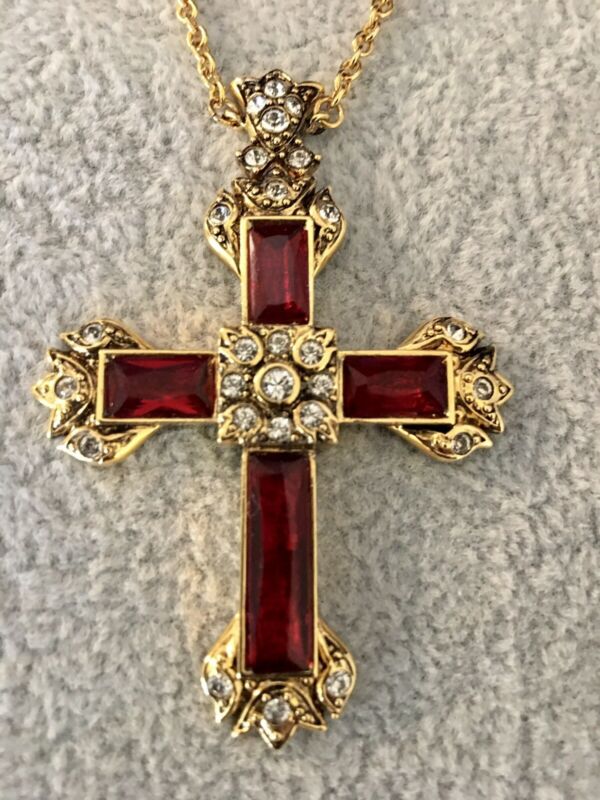 Title (ebay affiliate link): Antique Roadshow Gold Tone Red & Clear Rhinestone Cross Pendant