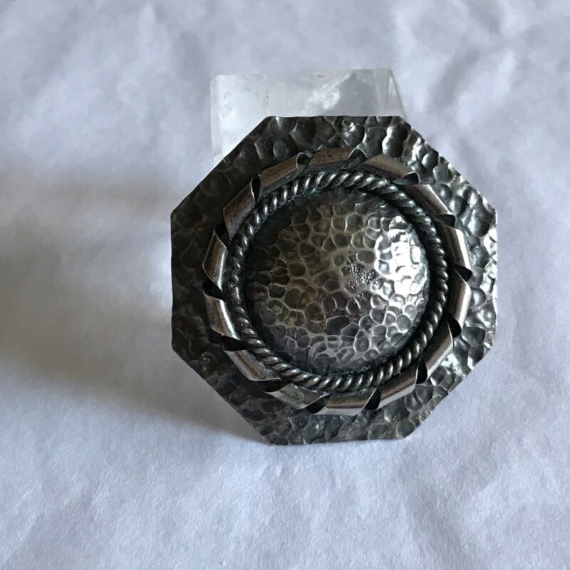 Antique Arts & Craft Period Octagonal Hammered Sterling Silver Brooch Pin Large