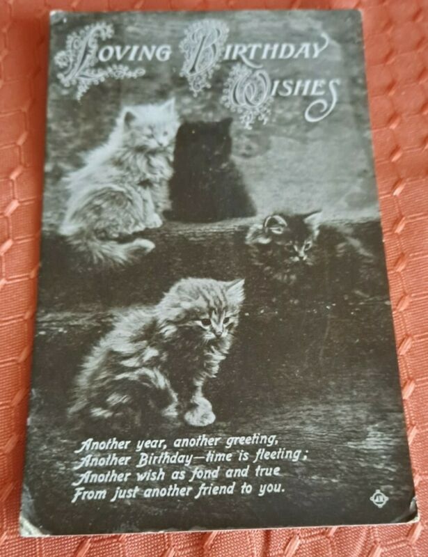 Vintage Cat Postcard. Birthday. 4 kittens sat on steps. British.