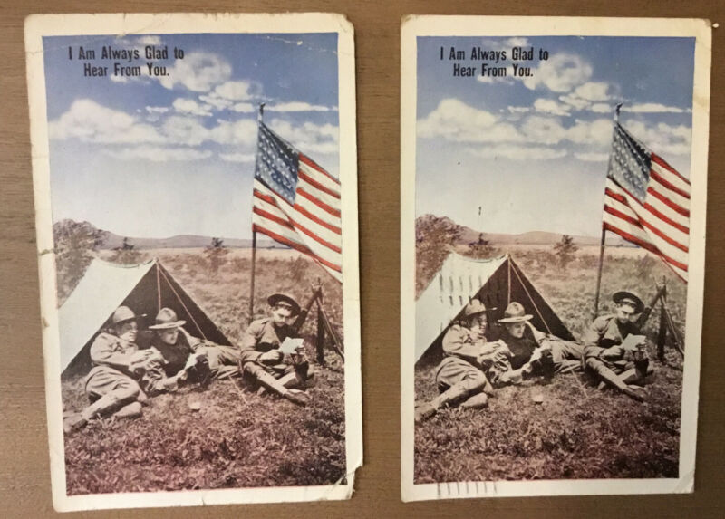 Title (ebay affiliate link): World War I Doughboy with Tent and US Flag Color Postcards (2) (Posted 1917)