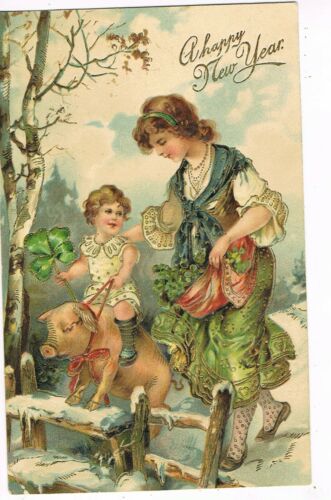 Title (ebay affiliate link): ANTIQUE EMBOSSED NEW YEAR Postcard (PFB) YOUNG GIRL RIDING ON PIG''S BACK