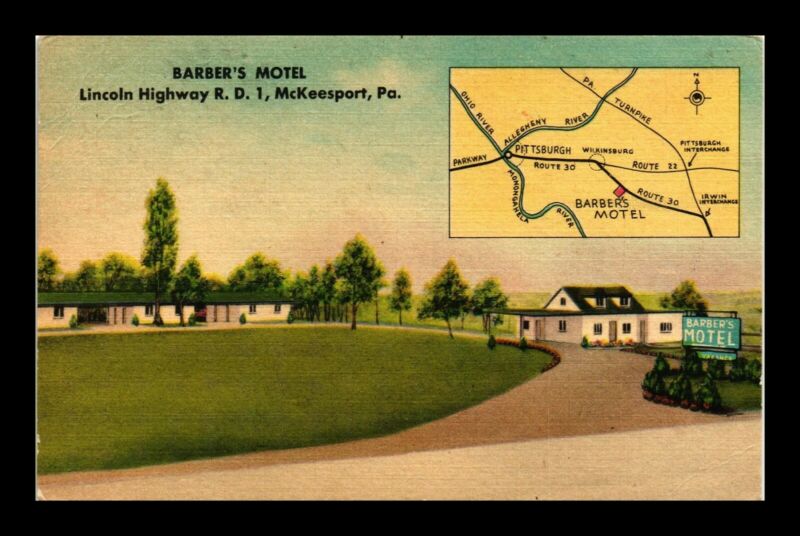 Title (ebay affiliate link): DR JIM STAMPS US BARBERS MOTEL MCKEESPORT PENNSYLVANIA VIEW LINEN POSTCARD