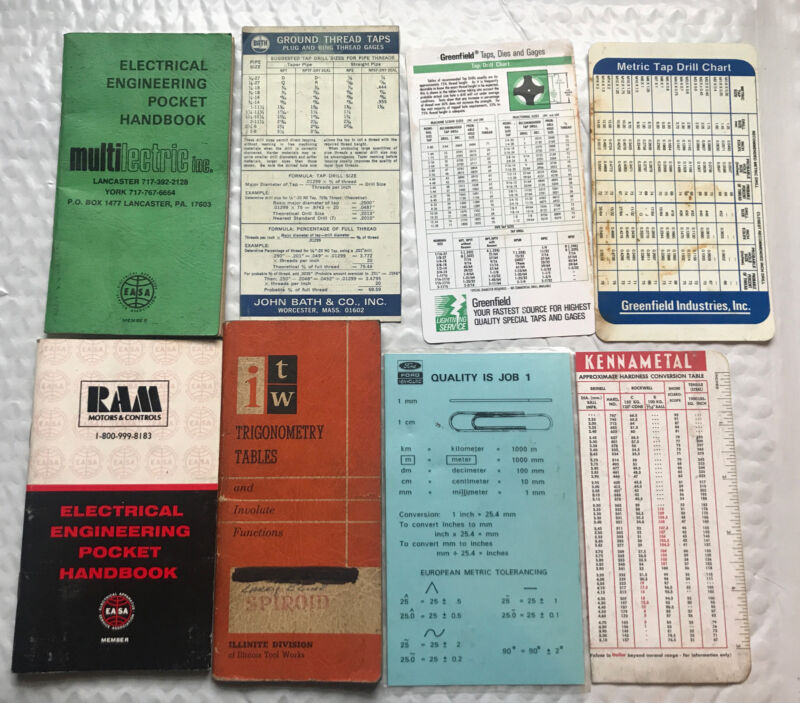 Title (ebay affiliate link): 8 VINTAGE MACHINIST MECHANIC GTD GREENFIELD TAP DRILL CHART & Pocket Handbooks