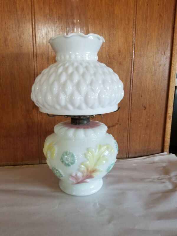 Title (ebay affiliate link): Beautiful antique kerosene oil lamp very colorful embosed patern working cond