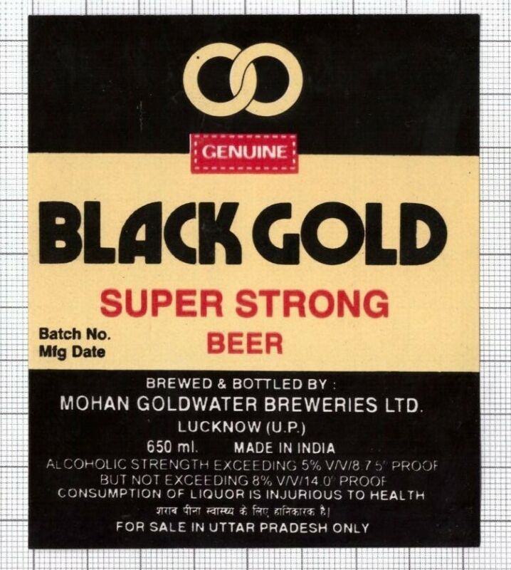 Title (ebay affiliate link): INDIA Mohan Goldwater Breweries Black Gold beer label B006 067