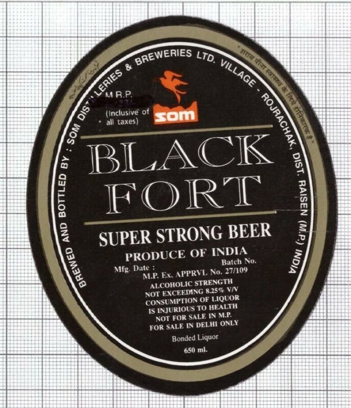 Title (ebay affiliate link): INDIA Som Distilleries & Breweries Raisen Black Fort beer label B006 082