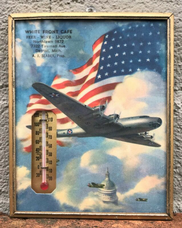 Vintage Advertising Thermometer, Bomber Plane, American Flag, Capitol, Detroit
