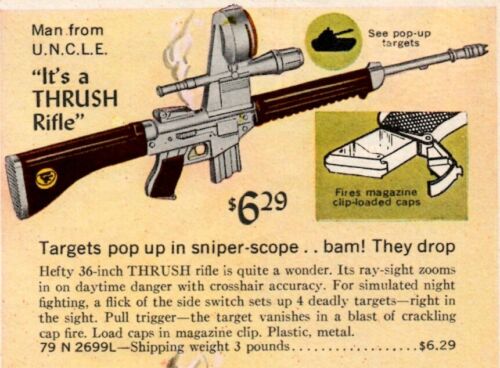 Title (ebay affiliate link): 1966 Christmas Catalog page only Bond 007 BARK Man from UNCLE Thrush Rifle Solo