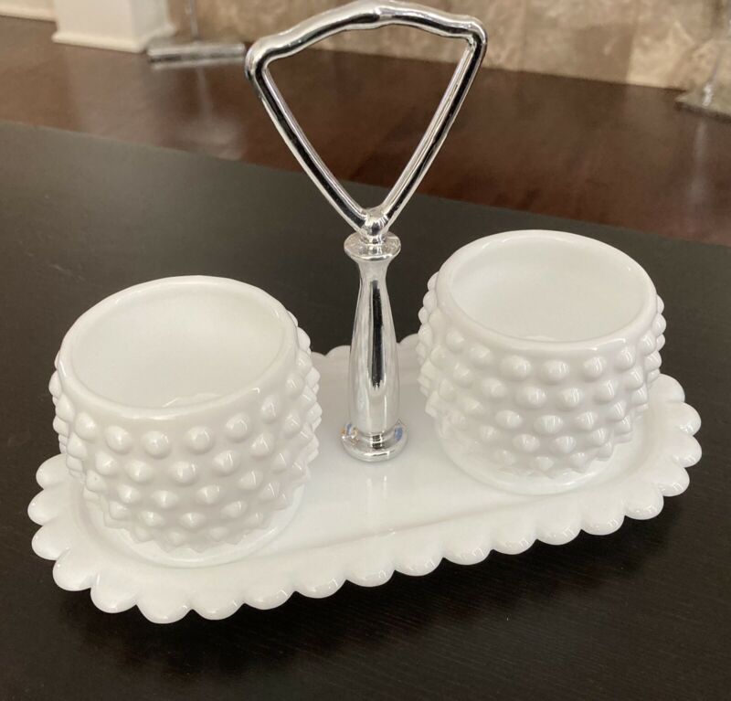 Westmoreland White Milk Glass Hobnail 2 Small Jars & Tray With Handle 3 Pieces