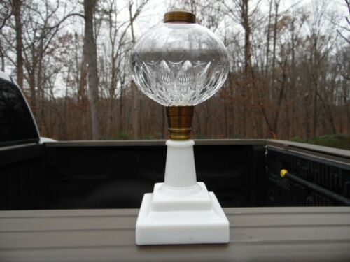 Title (ebay affiliate link): Antique EAPG Oil Lamp Stand / Milk Glass Base / Early Almond Thumbprint Pattern
