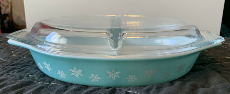 Vintage Pyrex Snowflake Divided Casserole With Lid