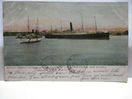 1900 POSTCARD BOSTON HARBOR CUNARD STEAMSHIP " IVIRNIA " BATTLE SHIP " OLYMPIA "