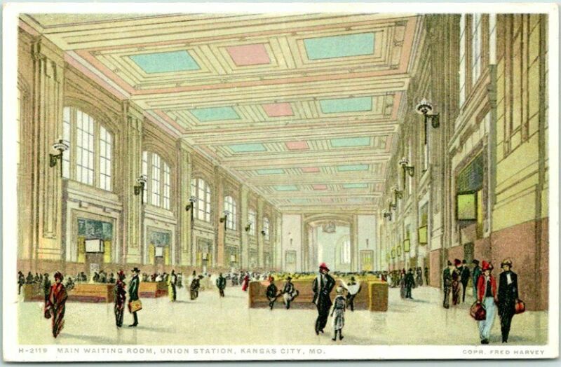 Title (ebay affiliate link): Kansas City, Missouri FRED Harvey H2119 Postcard "Waiting Room, UNION STATION"