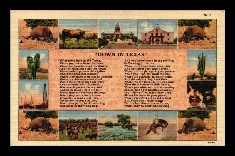 DR JIM STAMPS US DOWN IN TEXAS MULTIPLE VIEWS POEM TOPICAL LINEN POSTCARD