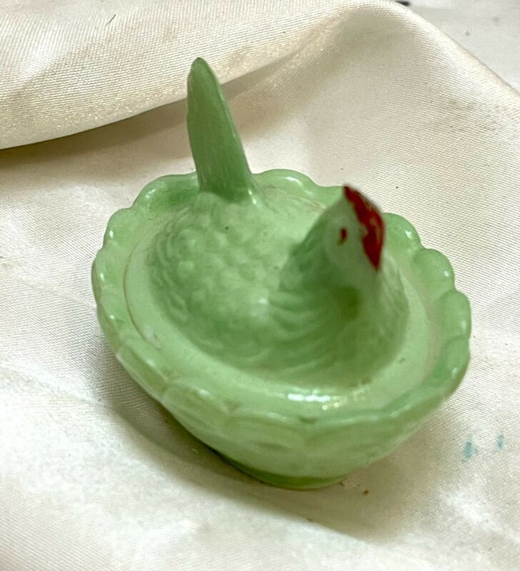 Title (ebay affiliate link): UNMARKED GREEN MILKGLASS MINIATURE HEN ON NEST SALT CELLAR