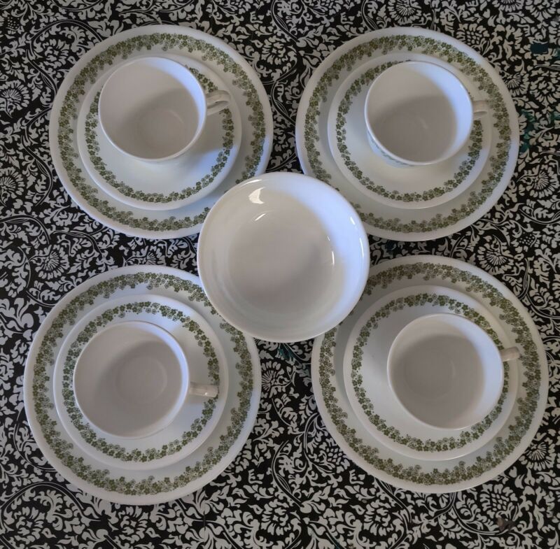 Title (ebay affiliate link): 13pc Corelle Spring Blossom Crazy Daisy Green Plates Cups & Saucers