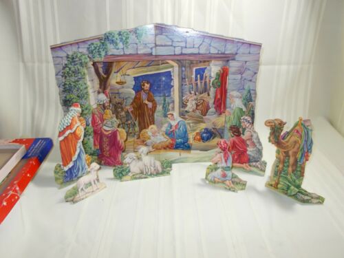 VINTAGE LITHO PRINTED CARDBOARD CHRISTMAS NATIVITY SET W/BOX USA