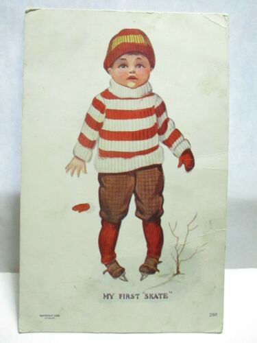 Title (ebay affiliate link): 1910 POSTCARD MY FIRST SKATE, LITTLE BOY WITH WOBBLY ANKLES