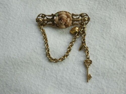 Title (ebay affiliate link): Vintage 1928 Jewelry Porcelain Rose Brooch w/Dangling Chain w/Heart & Key Charm