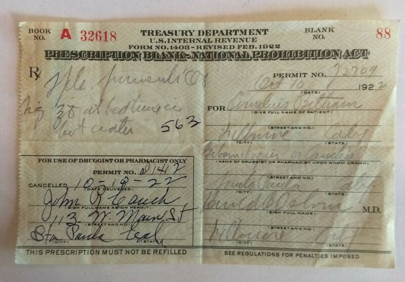Title (ebay affiliate link): Vintage 1922 Prohibition Era Alcohol Prescription