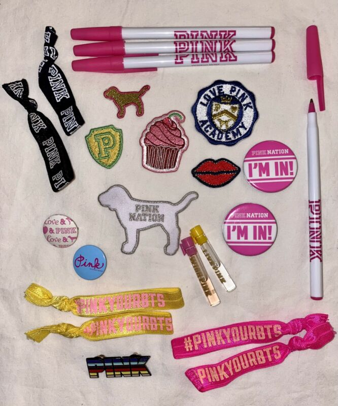 Title (ebay affiliate link): Victoria''s Secret PINK Lot: 4 Pens 5 Pins 6 Patches 6 Hair Tie Bands VINTAGE 00s