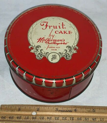 Title (ebay affiliate link): ANTIQUE FRUIT CAKE TIN LITHO CAN WOLFERMAN BAKERY KANSAS CITY TULSA OK CHRISTMAS