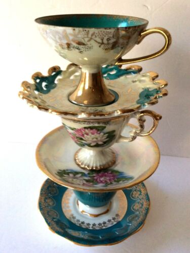 VINTAGE PORCELAIN PEDESTAL 3 TEA CUP & SAUCERS~ JAPAN LUSTERWARE + ROYAL STANRD