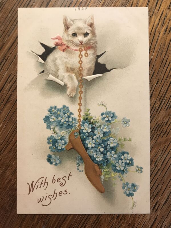 Title (ebay affiliate link): White CAT Kitten PINK Bow GOLD Shoe Antique Vintage 1909 Embossed Postcard!