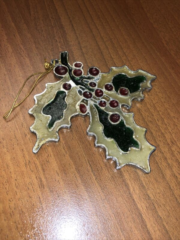 Beautiful Vintage Stained Glass Christmas Tree Ornament Suncatcher Holly Leaf